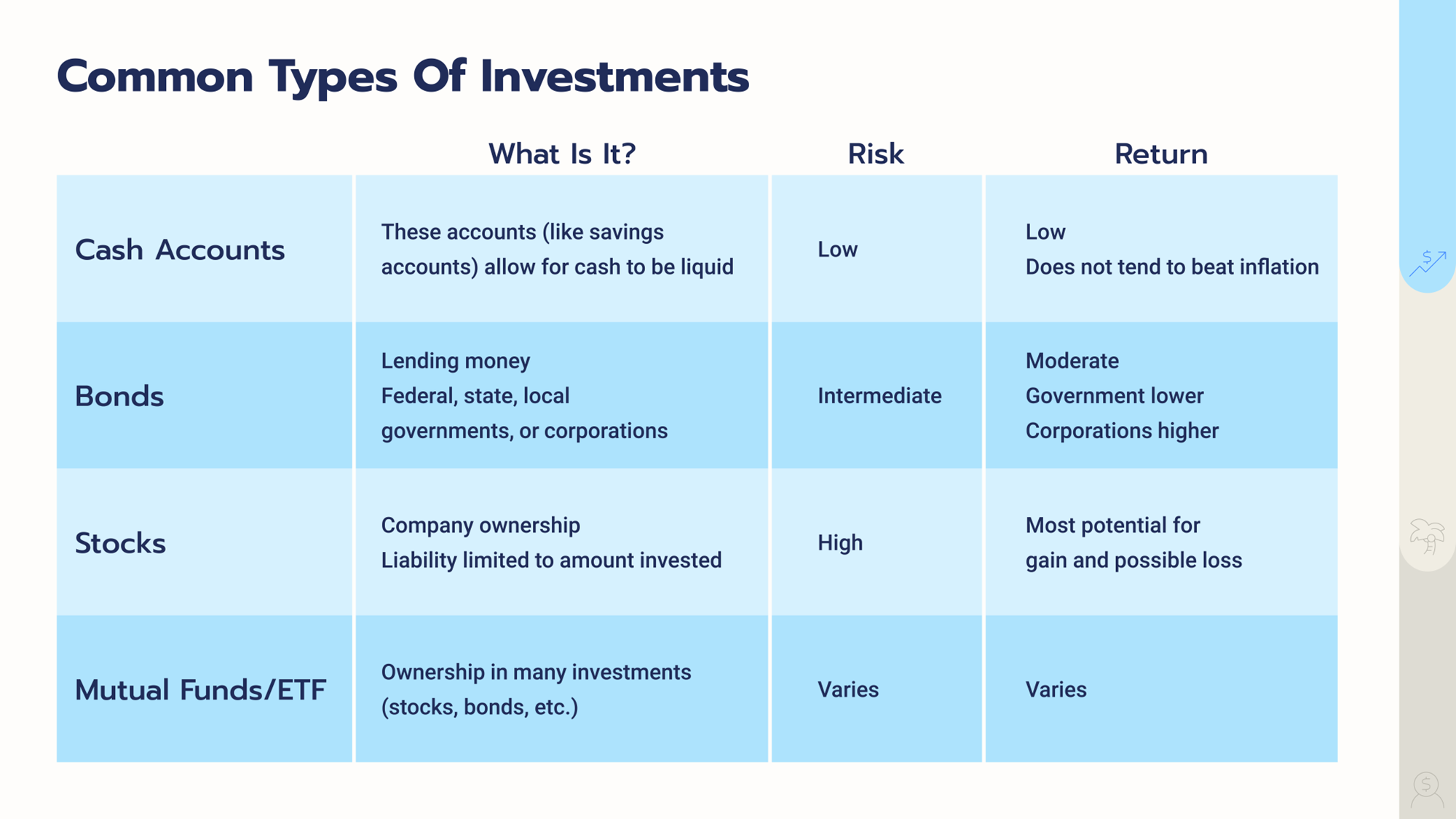 * Financial Beginnings – Foundations Investing 2 Slide DeckOne important concept across all of these: diversification. Spreading your money across different types of investments means one bad pick won't sink your whole portfolio. Think of it as not putting all your eggs in one basket. Mutual funds and ETFs all build diversification in automatically.