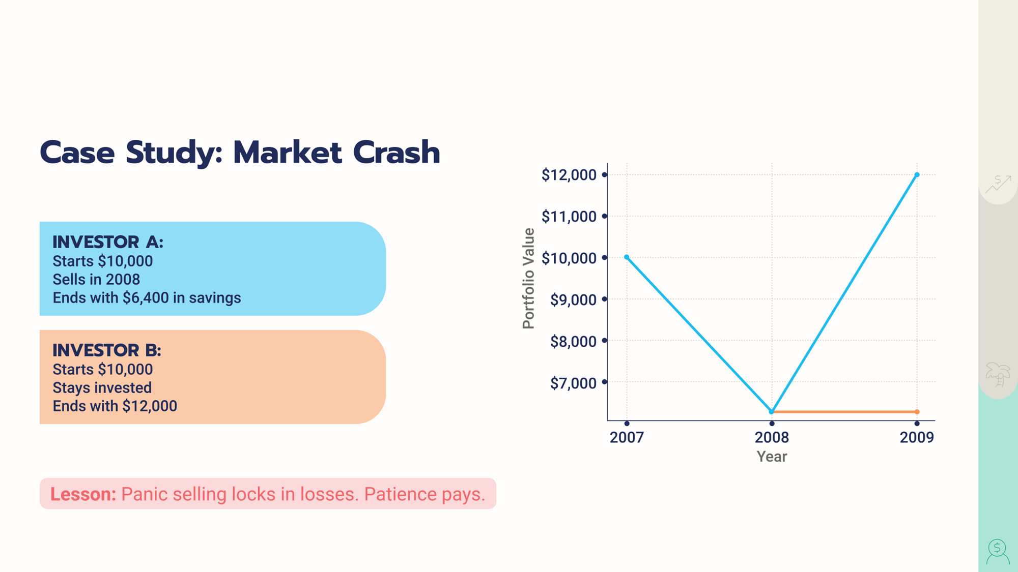 Consider the example below. Investor A started with $10,000, panicked in 2008, sold everything, and ended with just $6,400. Investor B also started with $10,000 but stayed invested and grew their account to $12,000.