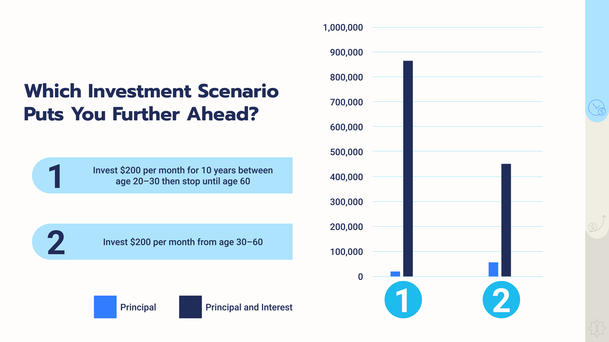 Time is the most powerful ingredient in investing. Below are two scenarios to visualize how investing at different life stages and amounts can make a difference.